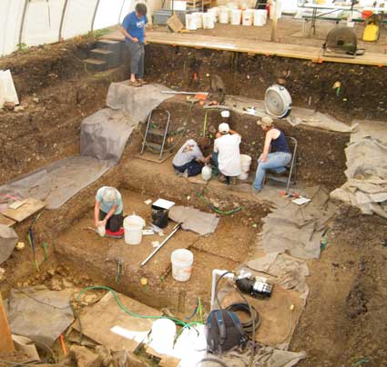 The presence of Clovis-era stone tools suggested that the paved floor dated to about 13,000 years ago. The team kept digging, and about 1 meter below the pavement and the Clovis tools, they found nine more flakes of shaped stone, along with a scattering of animal bones. Assuming that material found below the Clovis pavement must be older than Clovis, the researchers were intrigued. But there was not much to go on.