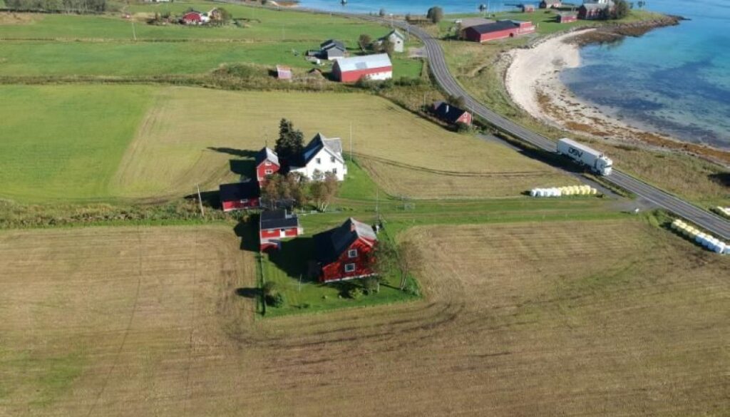 The Sandtorg Farm lies by the strongest current and has probably been a natural place to stop for travelers. Its location and historical sources make it plausible that a chieftain at the farm Sand on the other side of the straits controlled the shipping going through the strong currents in Tjelsund, and might have demanded tariffs of those travelling through the straits as early as the Early Iron Age.