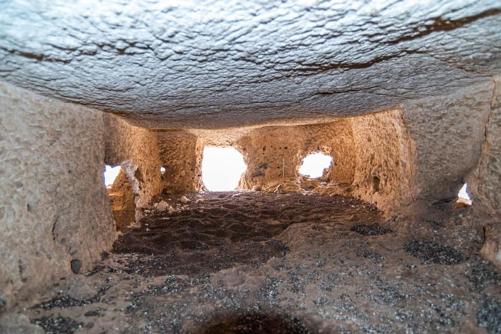 The groups are interconnected by narrow doorways cut through the bedrock wall. The chambers are rarely more than 1.20 meters high and are undecorated, but most have cut-rock features such as shallow niches, benches, rows of circular depressions or troughs cut in the floor, and many small holes in the walls just below the ceiling.