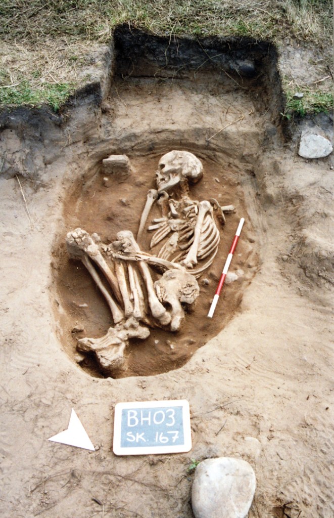 In 1998-2007, the cemetery was excavated by the Bamburgh Research Project (BRP), who wanted to assess whether the graves in their ever-shifting sandy setting were at risk of erosion. This long-running project confirmed that Bowl Hole was no Norse burial ground, but was one of the most northerly Anglo-Saxon cemeteries yet found, used for generations across the 7th and 8th centuries. Some 99 skeletons were excavated, together with the disarticulated bones of several more individuals – together representing the remains of at least 110 men and women, adolescents, children, and infants, offering a complete cross-section of the community who had once lived on this part of the coast.