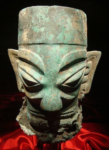 The archaeologists were surprised to find numerous bronze masks and human heads that have square faces, huge almond-shaped eyes, long straight noses, and exaggerated ears.